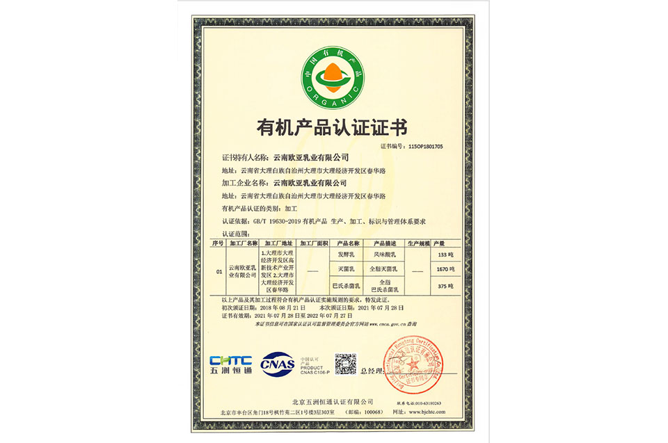 有機產(chǎn)品認證證書(shū)(乳品)